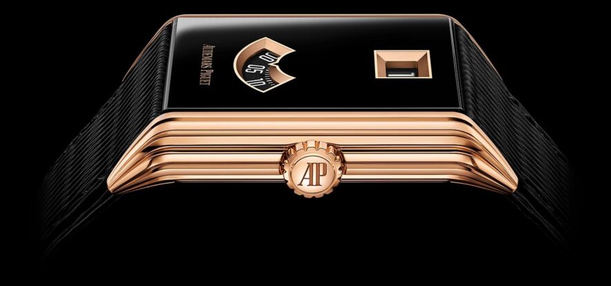 文字盤は、ブラックPVD加工を施したサファイアクリスタルによるツートーンデザインが特徴的。時と分のゴールドフレームのアパーチャーには黒地に白の数字がプリントされている。6時位置にはピンクゴールドカラーの「Audemars Piguet」ロゴが配される。
